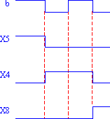 En el ejemplo siguiente tenemos un GRAFCET en el que la transición entre las etapas 5 y 4 está condicionada por el flanco de bajada de la variable b, exactamente igual que la transición entre las etapas 4 y 8; en el primer gráfico llega sólo un flanco que hace pasar de la etapa 5 a la 4 pero como cuando llega el flanco la etapa 4 no está activa, la transición siguiente no es válida y no puede pasar a la etapa 8 hasta que llegue otro flanco. En cambio en el segundo gráfico llegan dos flancos consecutivos, lo que permite pasar primero a la etapa 4 y después a la 8.
