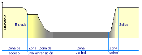 Se trata, por lo tanto, de un problema de diferencia de niveles de luminancia entre el exterior (3000-8000 cd/m2) y el interior del túnel (5-10 cd/m2). Podríamos pensar que manteniendo un valor de luminancia próximo al exterior en toda su longitud habríamos resuelto el problema, pero esta solución es antieconómica. Lo que se hace en túneles largos, con densidad de tráfico elevada o cualquier otra circunstancia que dificulte la visión, es reducir progresivamente el nivel de luminancia desde la entrada hasta la zona central. En la salida no hay que preocuparse de esto pues al pasar de niveles bajos a altos esta es muy rápida. Así pues, podemos dividir los túneles en varias zonas según los requerimientos luminosos: