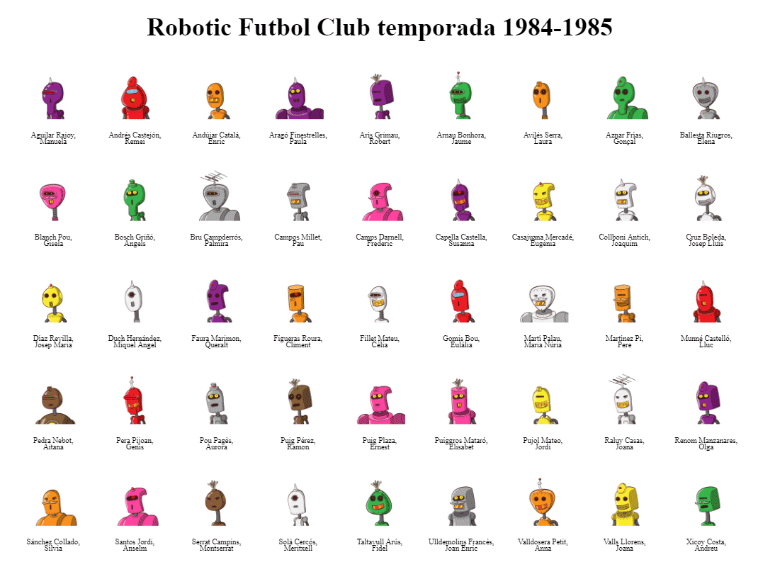 El que proposem en aquest exemple és poder crear, de manera automatitzada, l'orla de les persones que han acabat uns estudis, la llista de membres d'un quip esportiu amb fotografies, etc. El resultat obtingut tindrà un aspecte semblant al que es mostra a continuació: